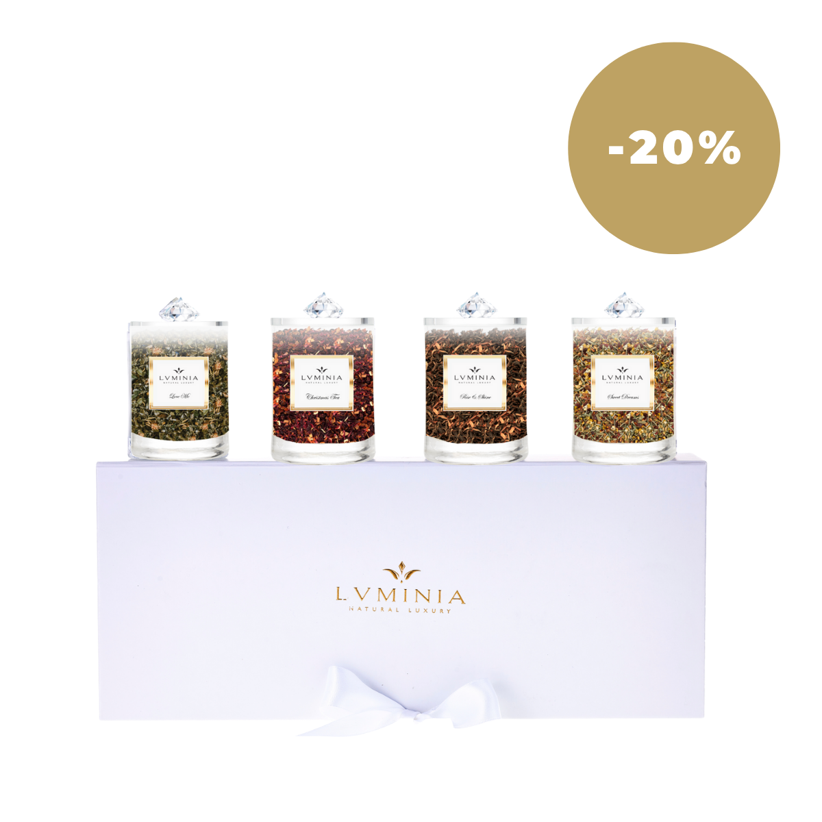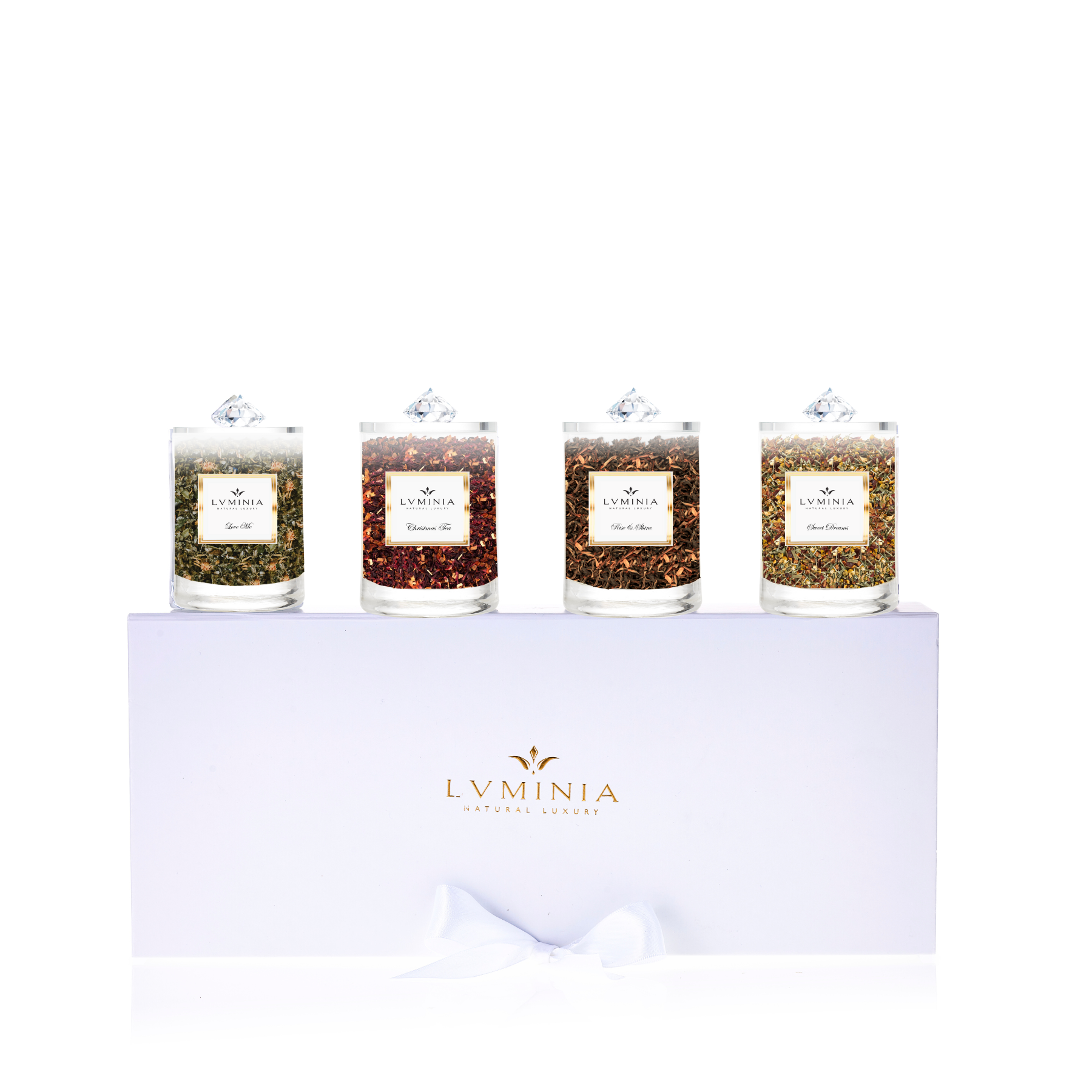 Luxusná darčeková kazeta spájajúca štyri výnimočné sypané čaje LUMINIA Love Me, Christmas Tea, Rise & Shine a Sweet Dreams.